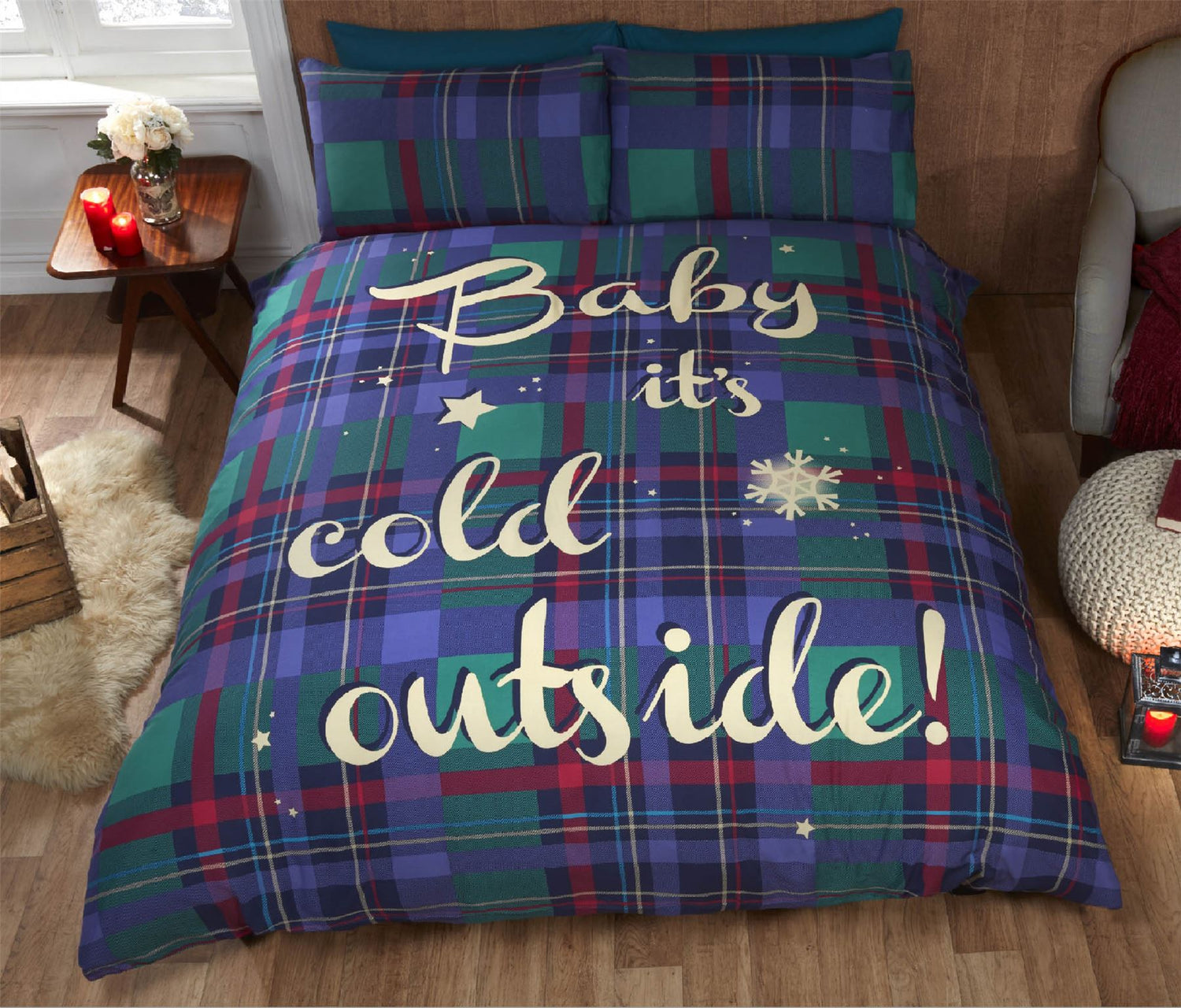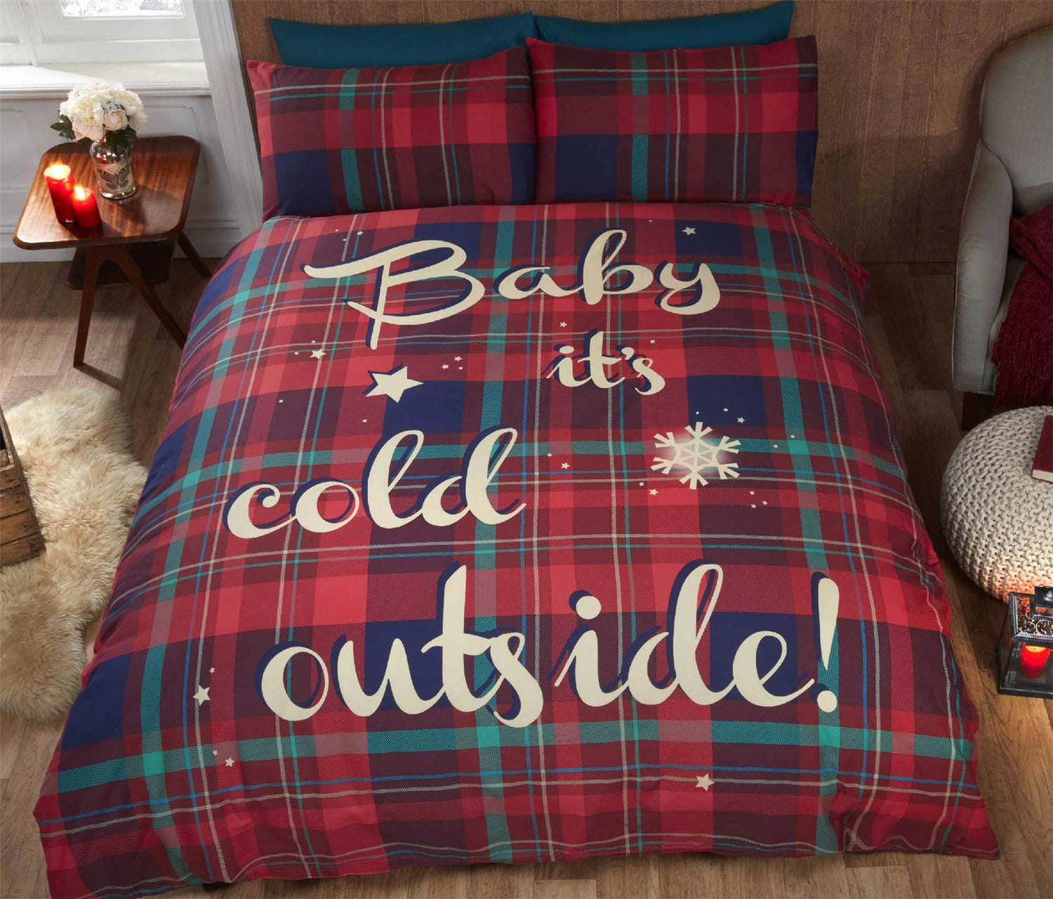 Cozy tartan print duvet cover and pillowcase set featuring festive slogan for a warm bedroom look