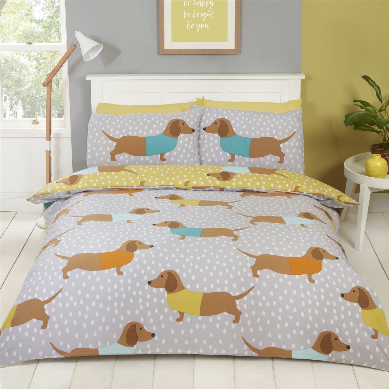 Bright and fun dolly dachshund duvet covers feature cute sausage dogs on a yellow polka dot background with a co-ordinating grey reverse design. This contemporary print would work well throughout any bedroom.