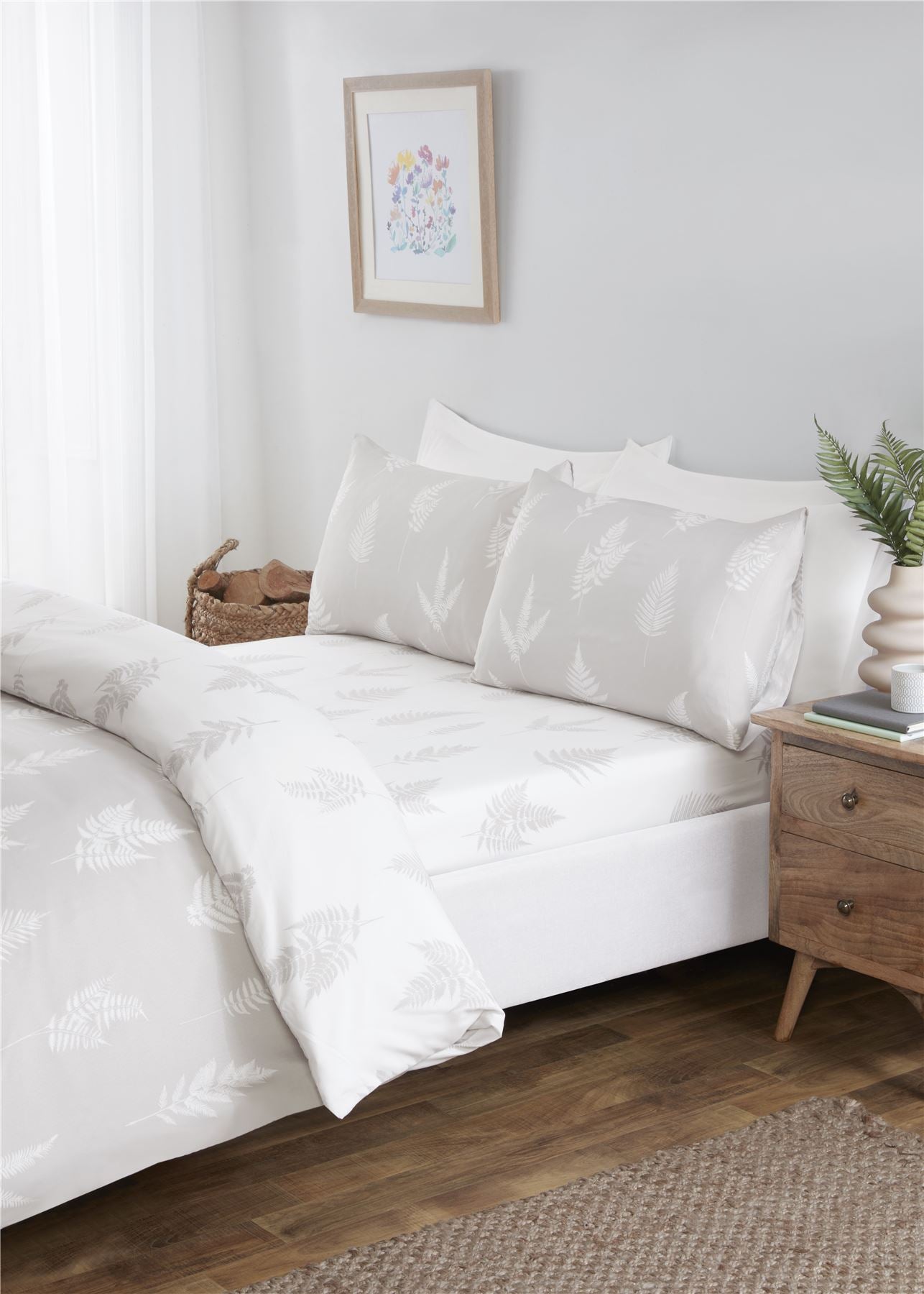 Elevate your bedroom decor with our Fern Complete Set featuring a stylish white and grey leaf print. Made from high-quality microfibre material, this complete set is not only soft and comfortable but also durable, ensuring a good night's sleep for years to come. The set includes a duvet cover, matching fitted sheet and matching pillowcases, all adorned with the elegant leaf design for a touch of nature-inspired beauty in your bedroom.