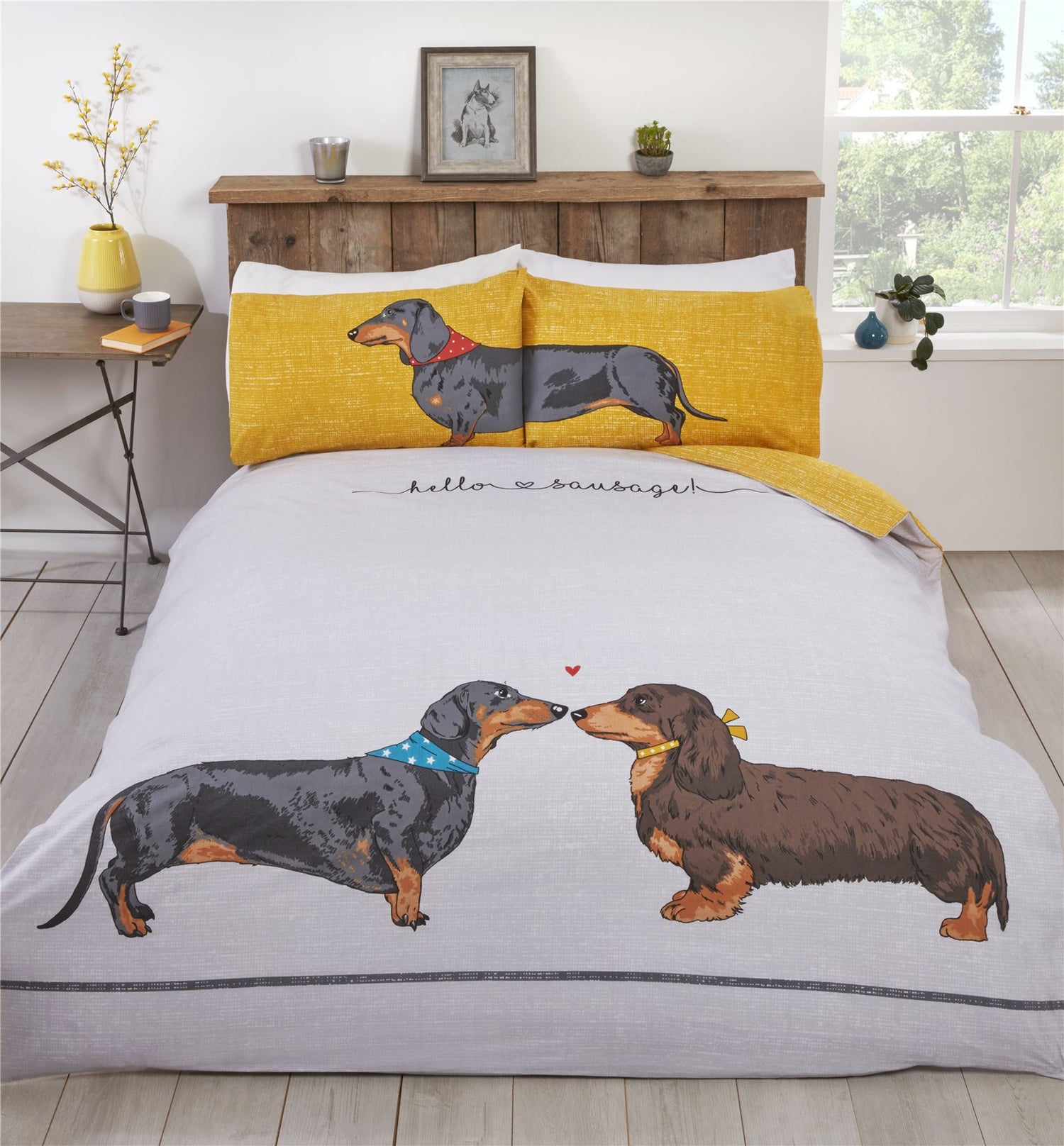 A quirky and fun panel printed duvet set featuring endearing dachshund dogs and fun "hello sausage" slogan. Fully reversible with a contasting textured ochre reverse to change up as your mood takes you.