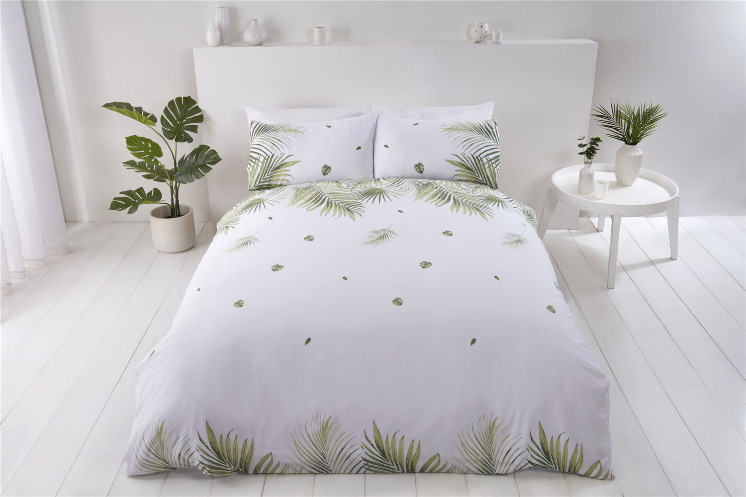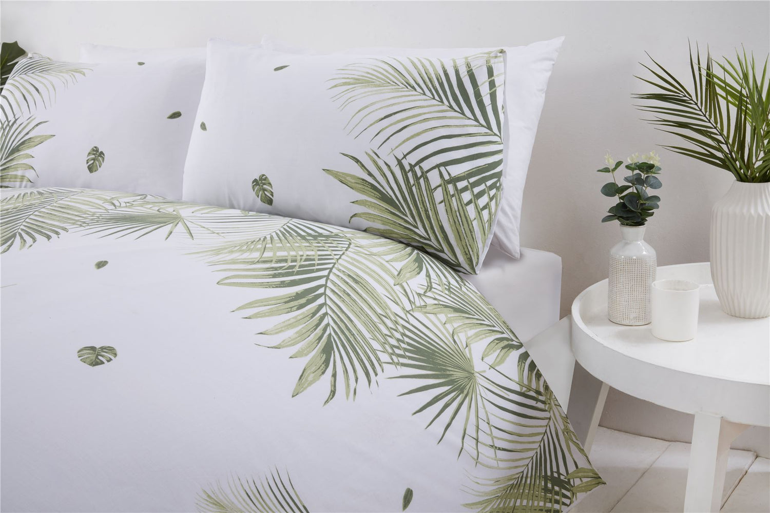 Our Tropics design is made using sustainably sourced BCI cotton & recycled polyester. Designed by British designers. This design has a fresh, clean feel. With bold tropical leaves on the front and small scattered leaves on the reverse, It will bring a touch of class to any bedroom.