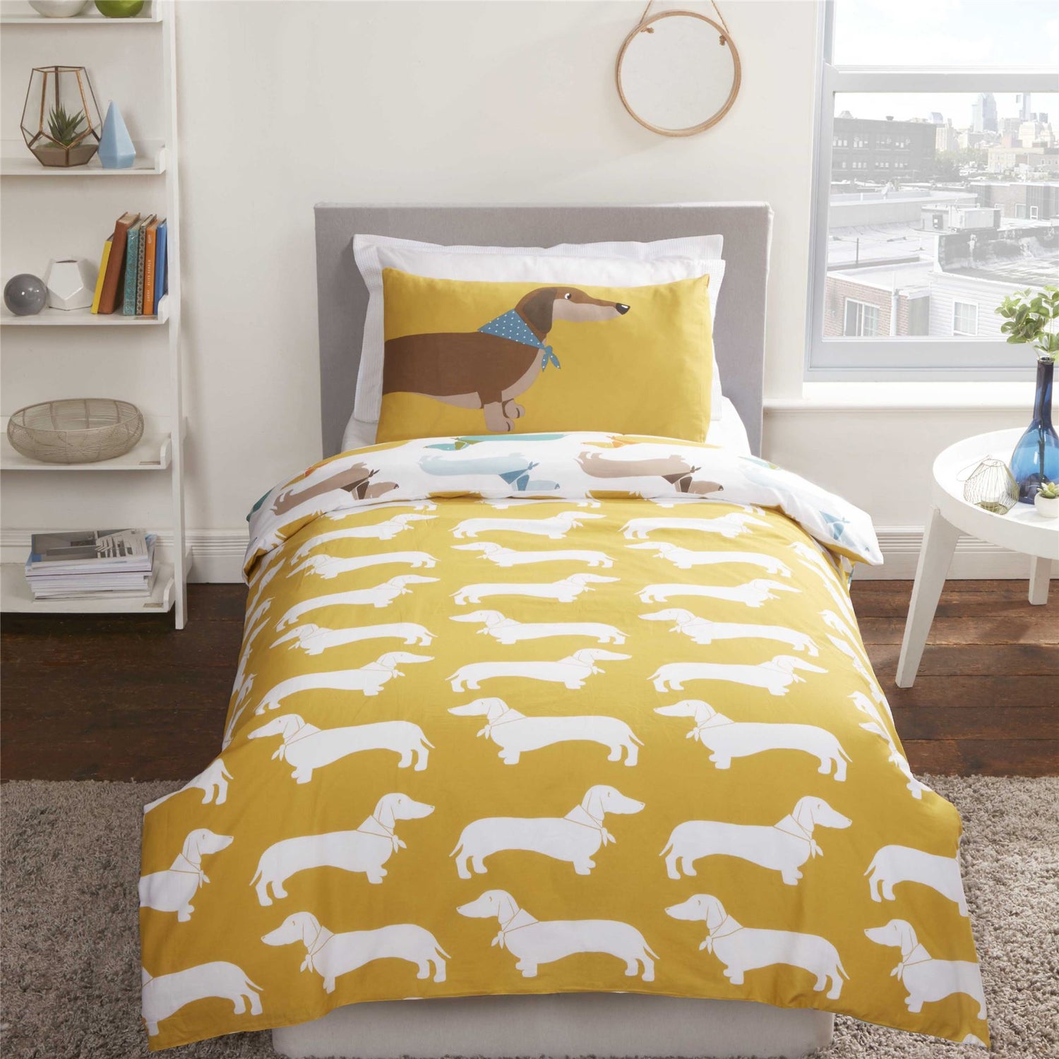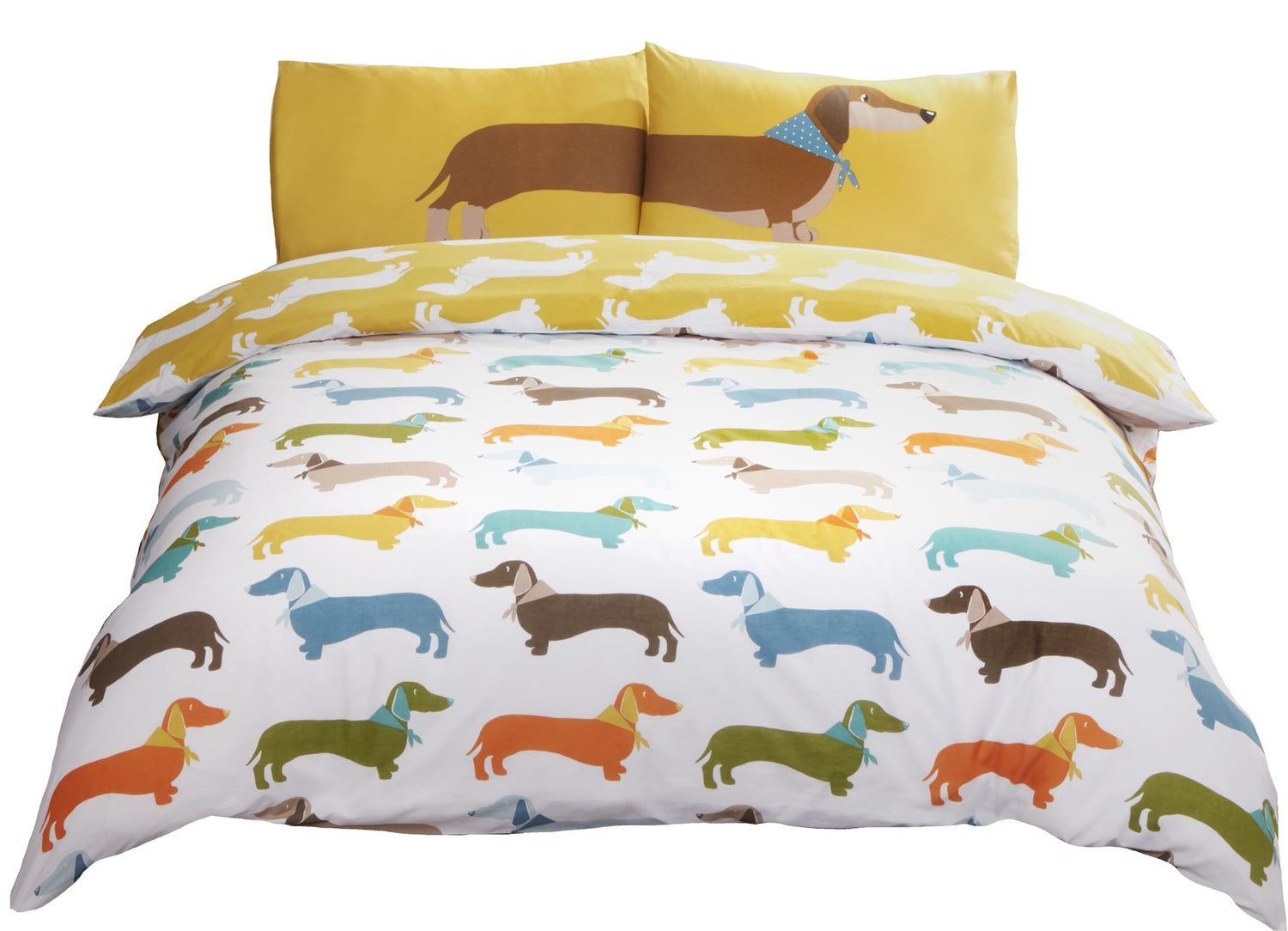 Contemporary and funky reversible duvet set with a cool multicolour sausage dog printed design and a co-ordinating ochre yellow reverse. The pillowcases are a fun feature showing the sausage dog stretching across the two, or wrapping around the single.
