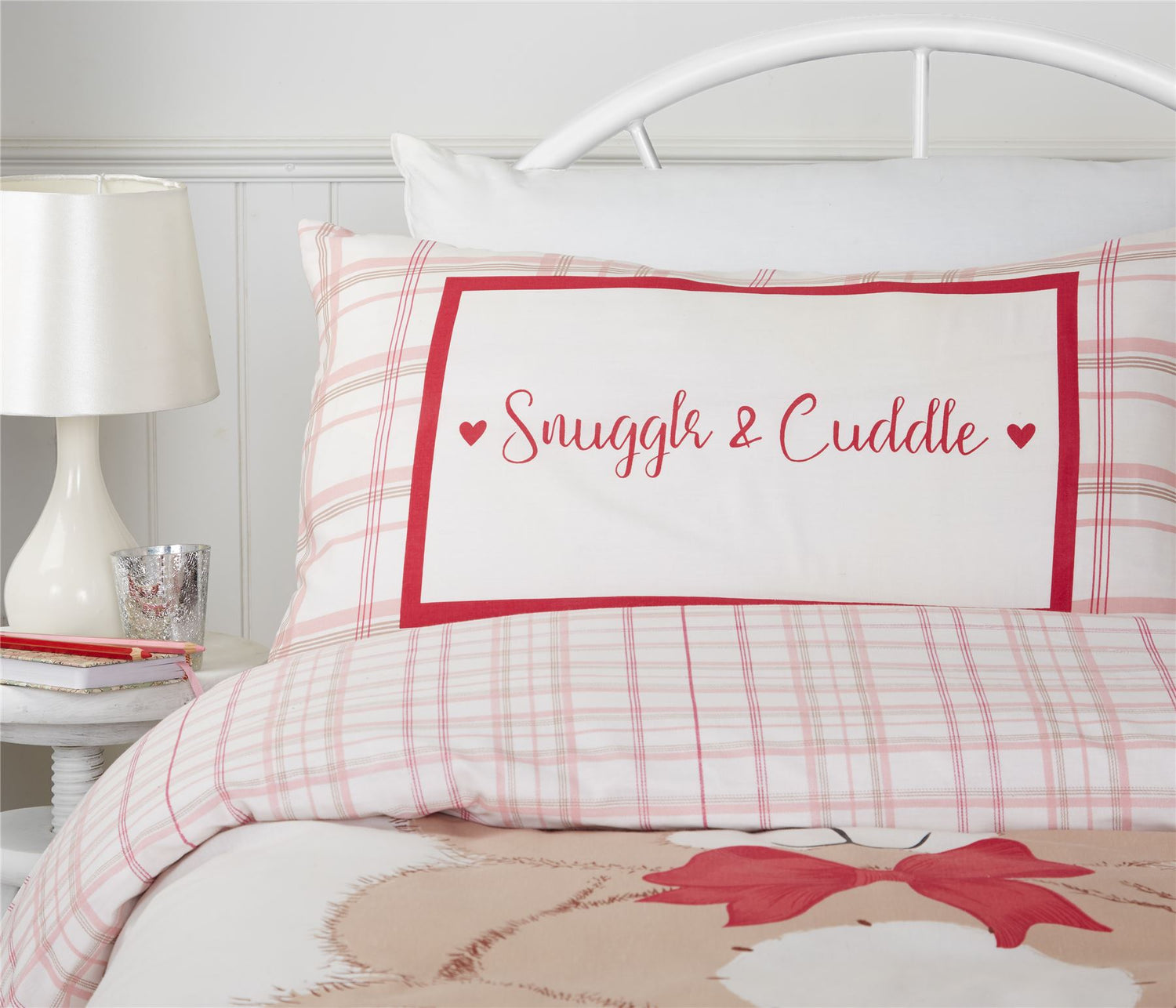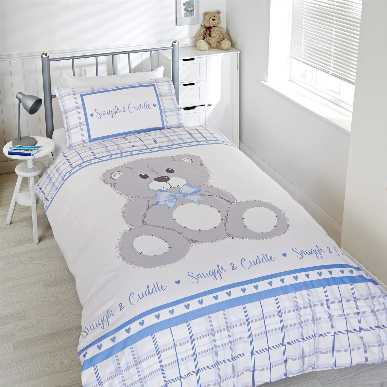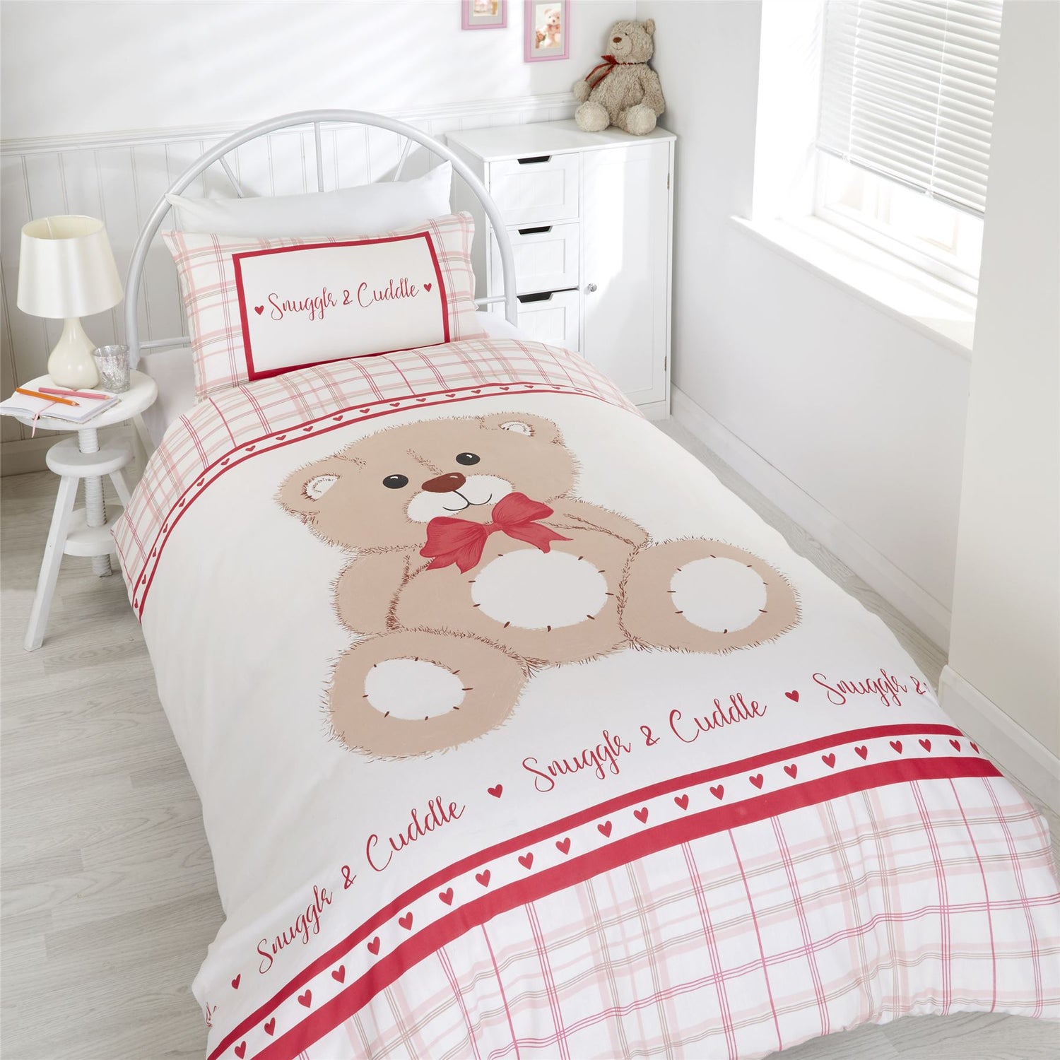 Cute and cuddly snuggle and cuddle duvet set featuring a teddy bear and check print, perfect for adding a touch of colour to your kid's room.