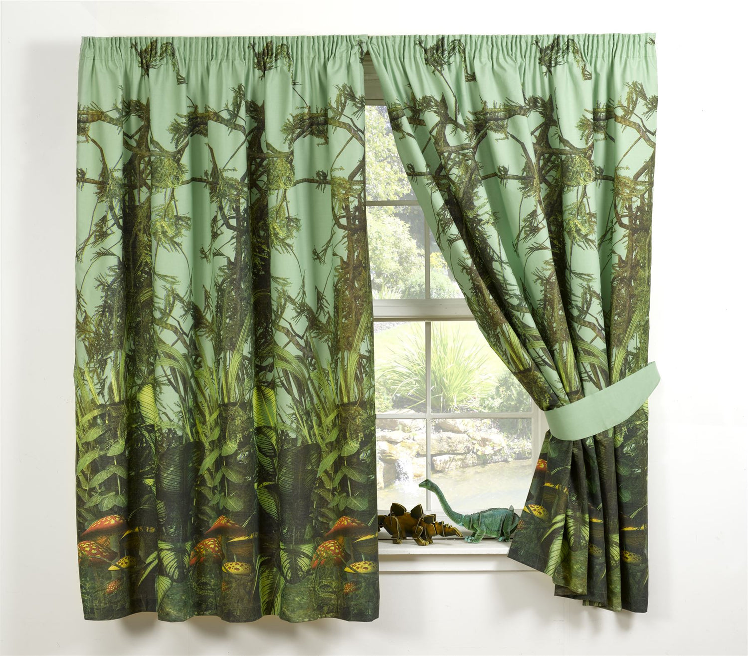 Leafy jungle themed printed curtains. The perfect coordinate to our ferocious t-rex duvet set.