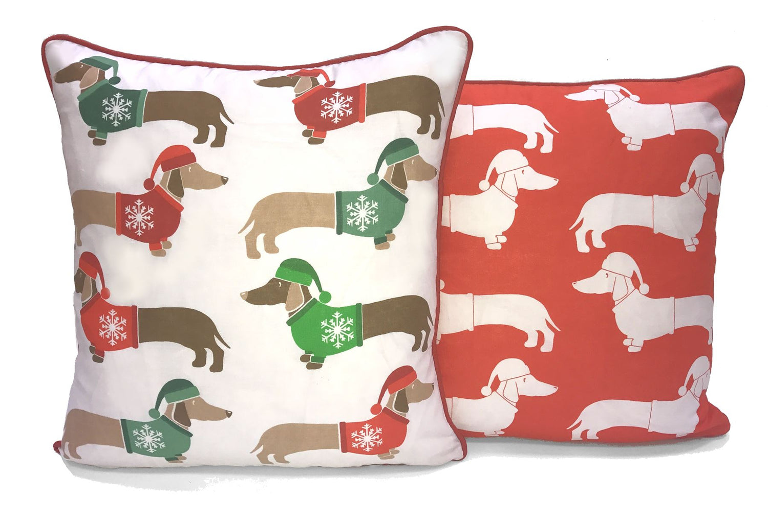A colourful reversible cushion featuring a playful all-over sausage dog design, measuring 43x43cm, with a piped edge finish
