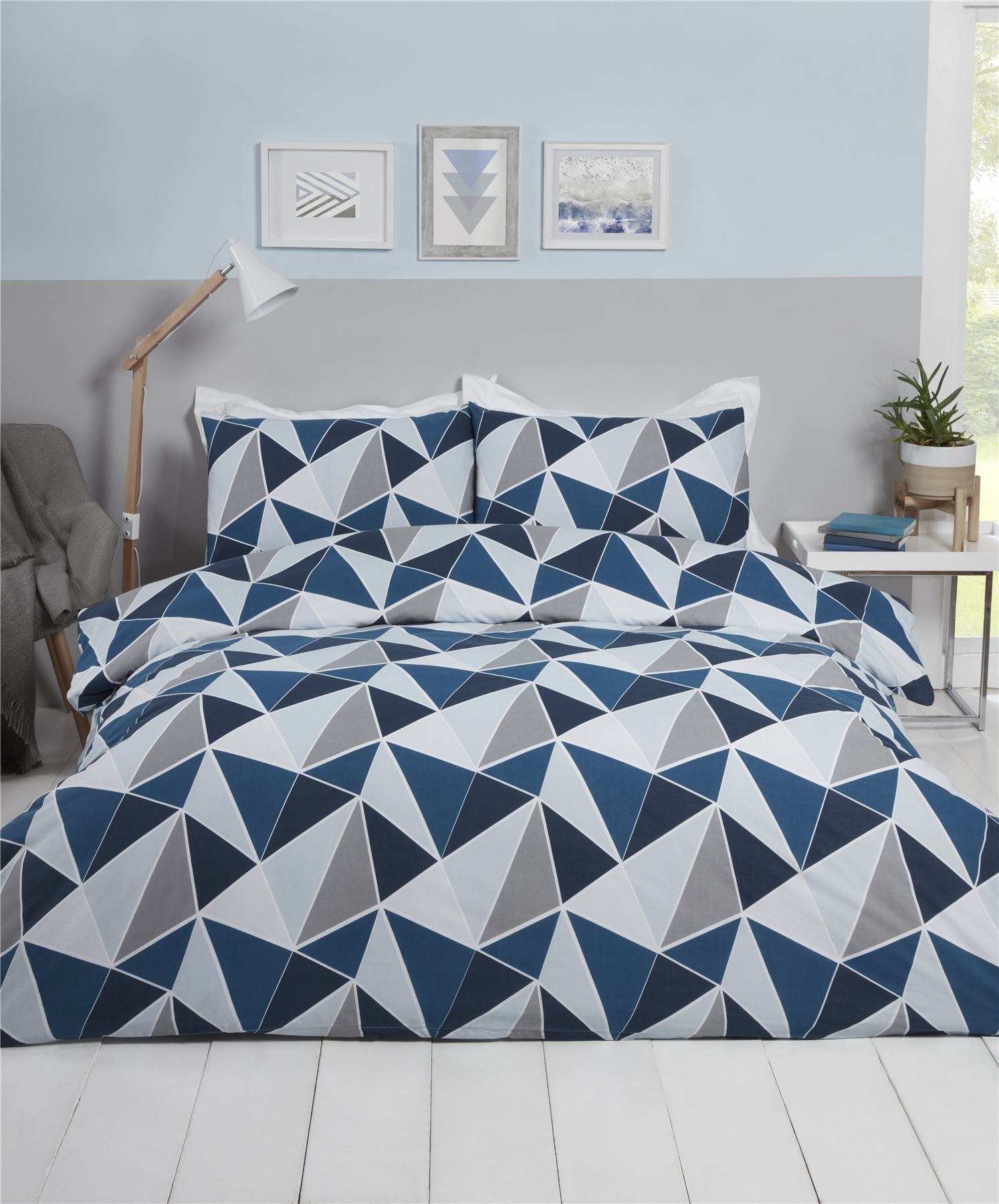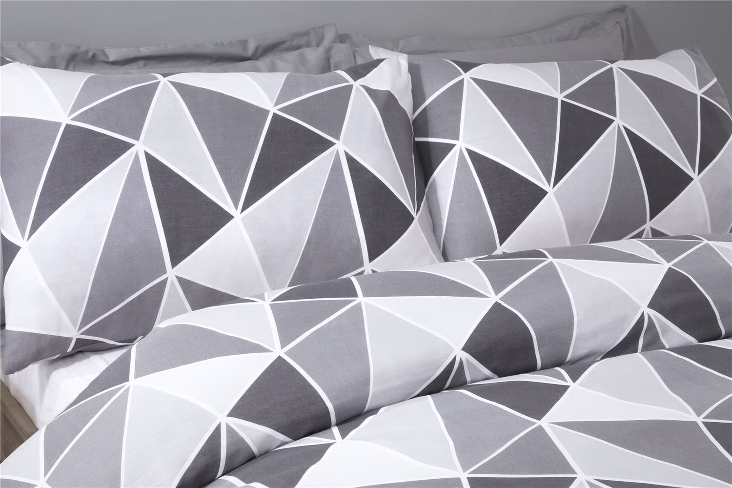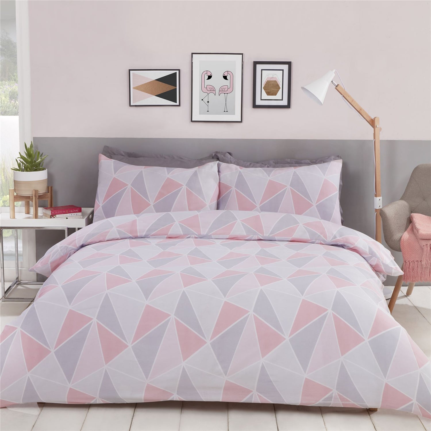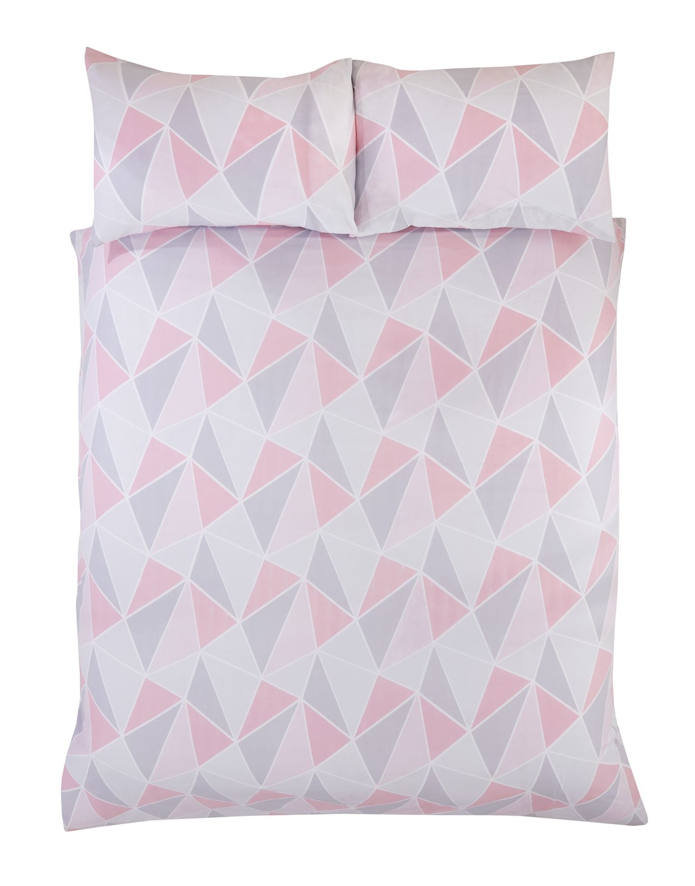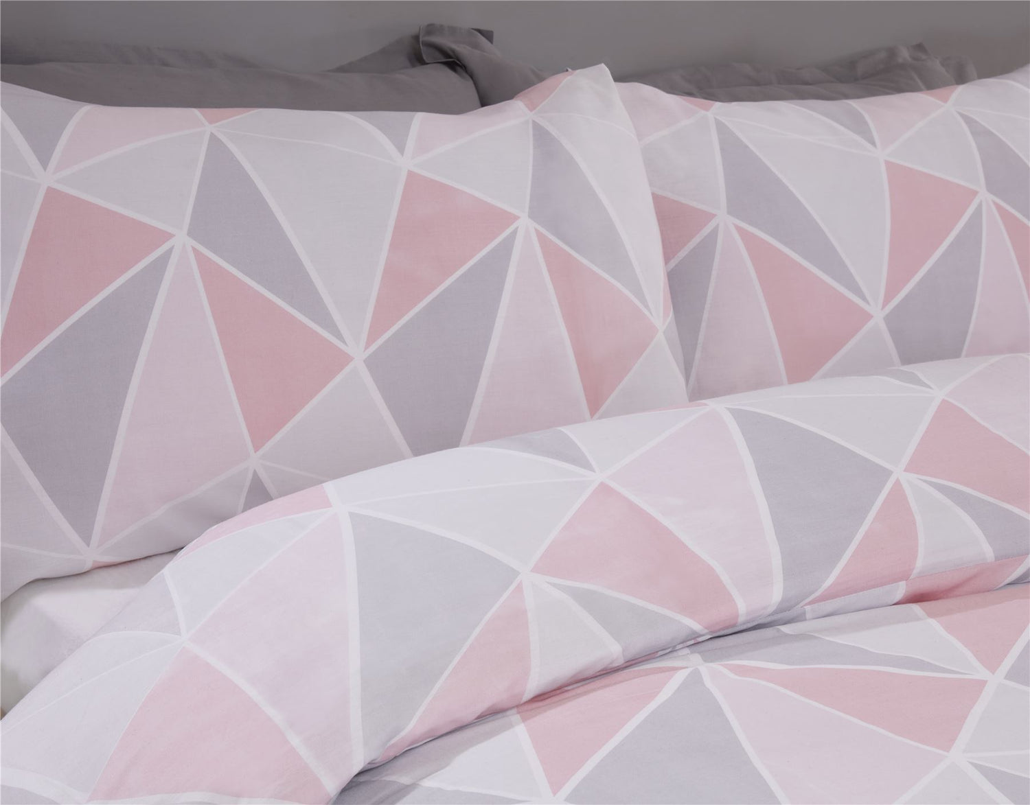 Add some contemporary style to your bedroom with these geometric leo duvet covers. Featuring on-trend abstract triangles in shades of blush pinks and grey, this duvet set will bring a fresh approach to your space and look great in any bedroom.