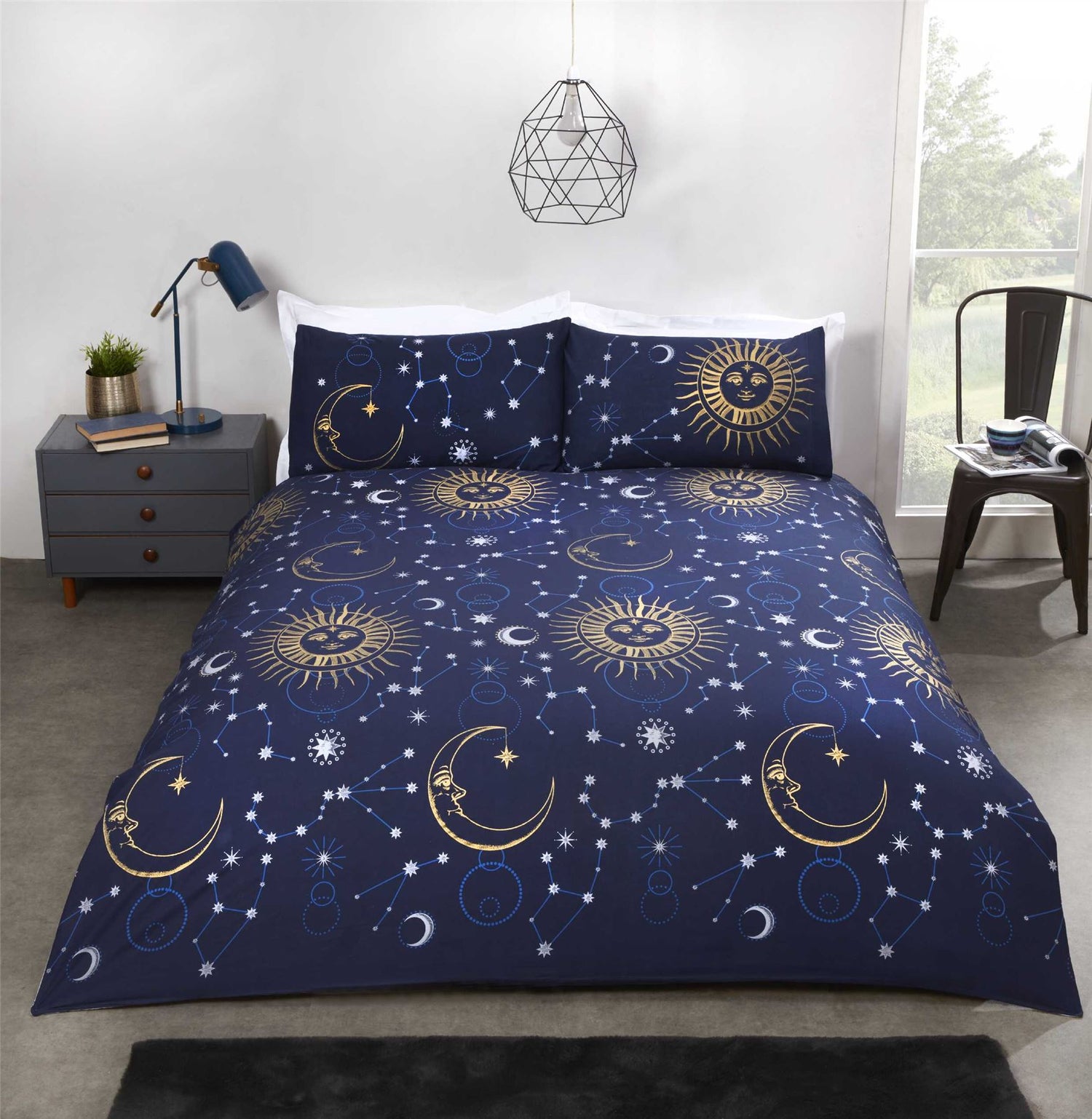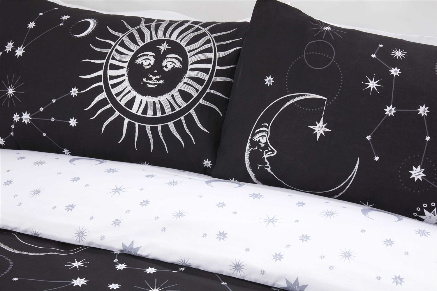 Stunning celestial duvet set featuring an ethereal design of metallic suns and moons on a rich dark background. This design is also fully reversible with an angelic, contrasting ditsy star reverse.