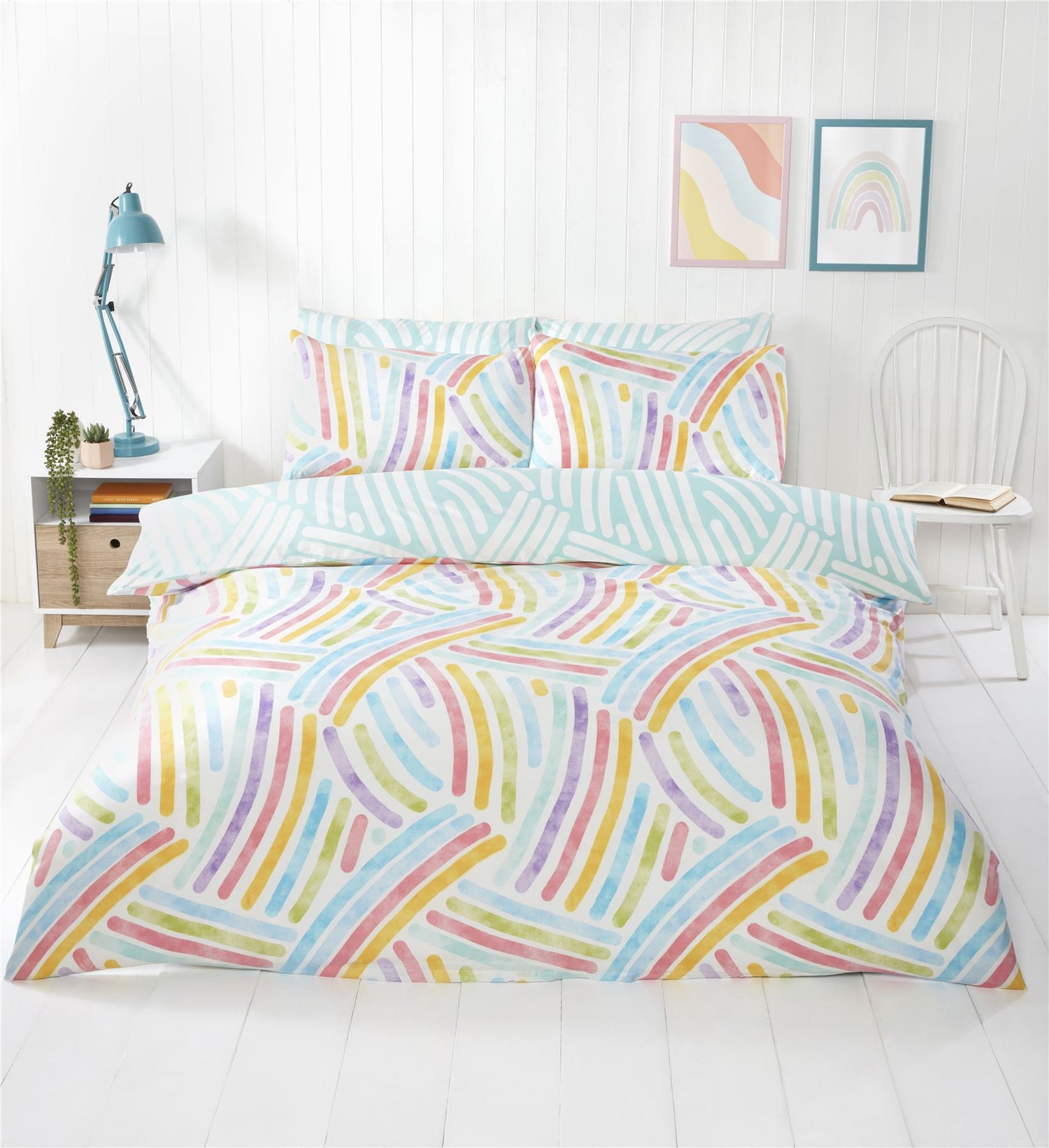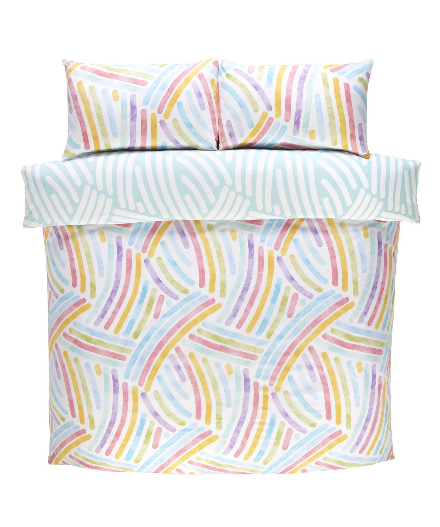 Our So Soft printed bedding range is perfect for a great night's sleep. Cosy and gentle against your skin, made with 180 thread count microfibre, making it non-iron and also durable. This design features an all-over abstract rainbow pattern with a contrasting reverse in aqua and white.
