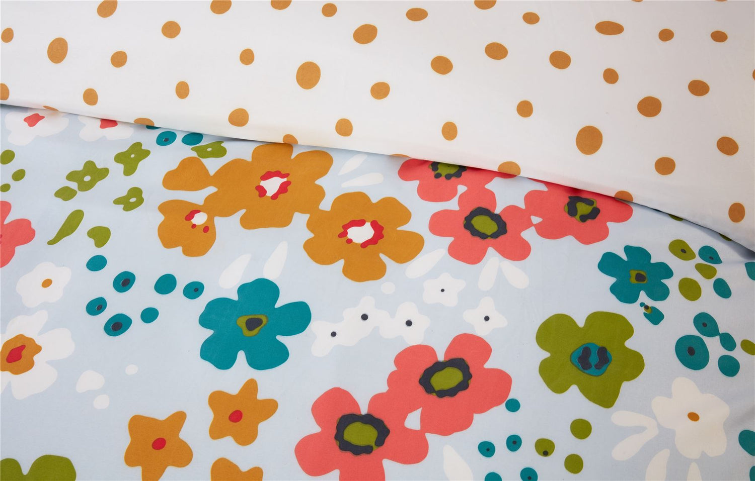 Brighten your bedroom with the lively charm of this floral duvet cover. The Betty duvet cover boasts a delightful, scattered floral pattern that exudes a carefree, artistic vibe. Featuring a playful array of stylized flowers in a palette of warm oranges, soft pinks, and cool blues and greens, this bedding set brings a touch of whimsical garden flair to your space. This combination of whimsical florals and classic polka dots creates a unique and appealing aesthetic, perfect for adding a touch of personality to your bedroom décor.