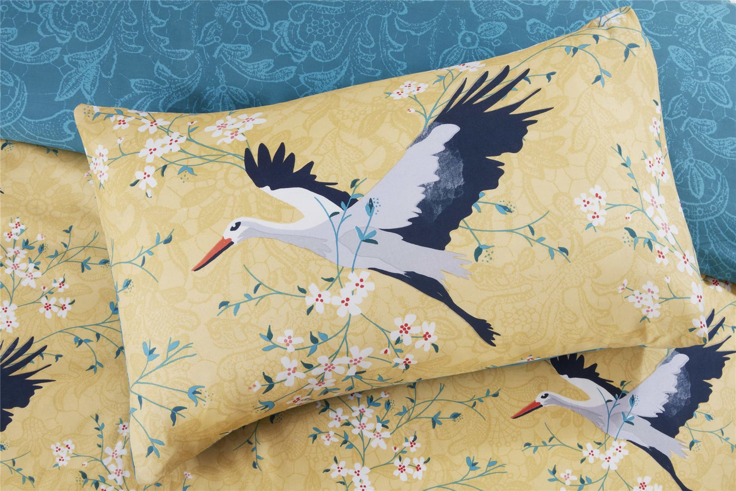 Our new and exclusive Cranes design will add a splash of colour and quirkiness to any bedroom. Featuring elegant cranes in flight on an ochre backdrop. Fully reversible with a printed lace pattern reverse in teal. Perfect for a good night's sleep our So Soft printed bedding range is cosy and gentle against your skin. Made with 180 thread count microfibre making it non-iron, durable and machine washable.