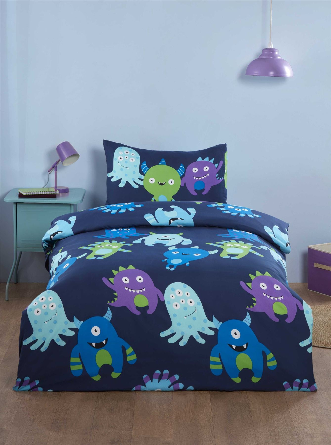 This Monster Duvet Set with pillow case is perfect for kids who love fun and colorful designs. The bed features a playful blue and purple monster print that will add a touch of whimsy to any child's bedroom. Made from high-quality materials, this duvet set is not only stylish but also comfortable for a good night's sleep. The set includes a duvet cover and matching pillow case, making it a complete and delightful addition to any child's room.