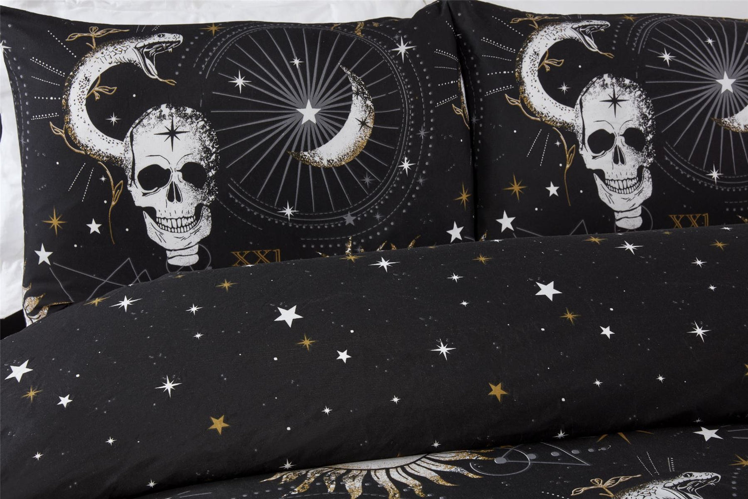 Introducing our enchanting Gothic-inspired bedding set, designed to transform your bedroom into a mystical realm of dark allure. Embrace the dark beauty of the night with a striking blend of skulls, suns, and moons, perfect for those who revel in the spirit of Halloween all year round. Fully reversible.