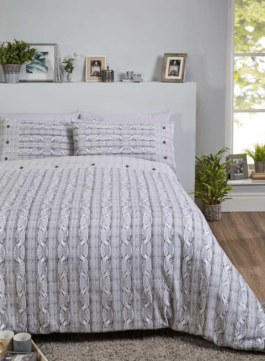 Our arran cable knit design duvet cover uses neutral beige tones to create a contemporary duvet cover, with a knitted effect printed onto super soft 100% cotton fabric and has real wood effect buttons.