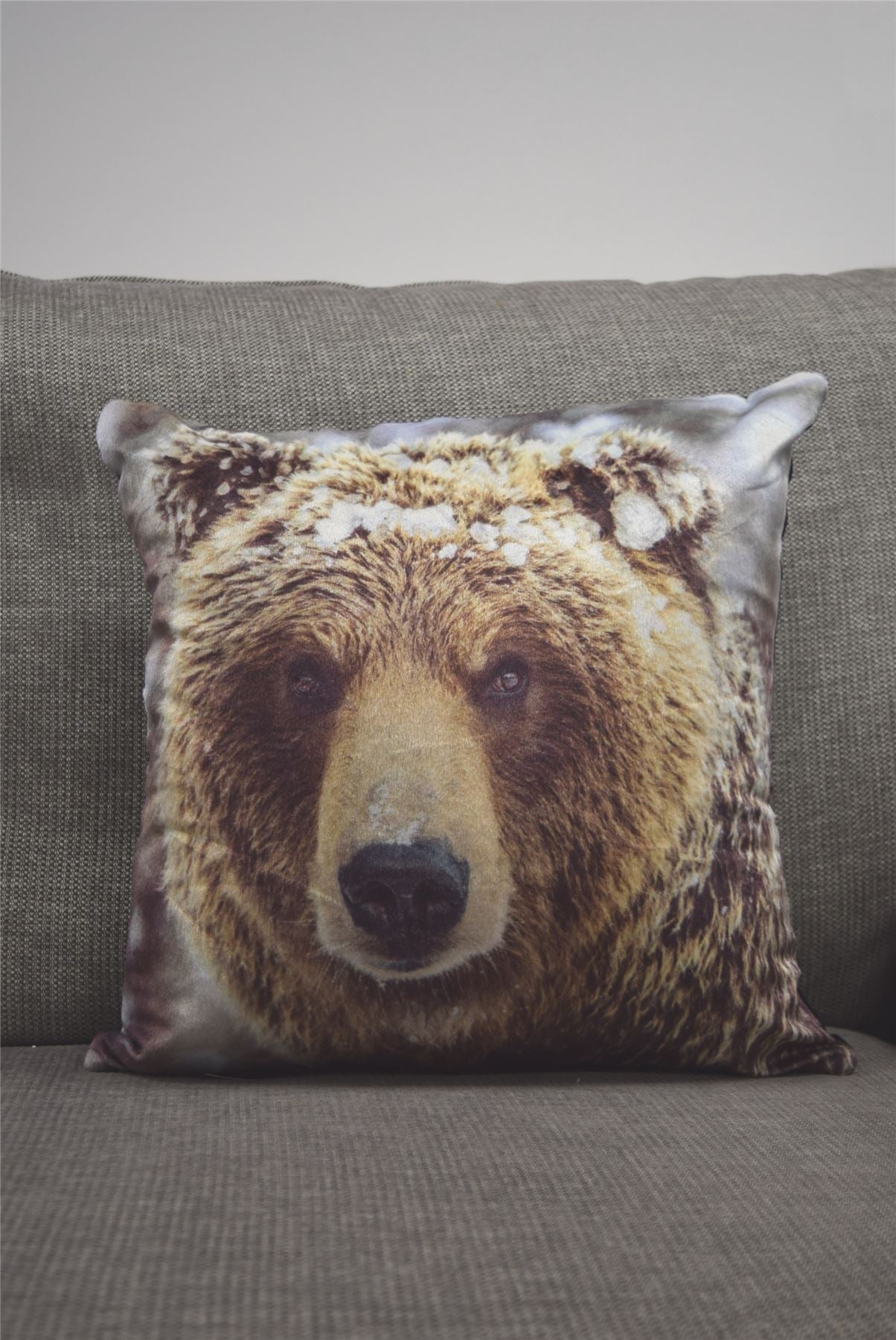 A stunning photographic velvet cushion measuring 43x43cm featuring a wild bear design in vibrant colours