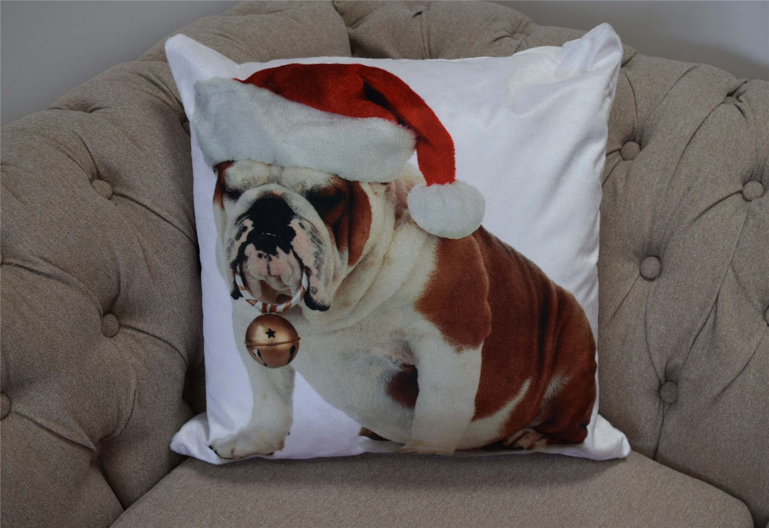 A festive Christmas velvet cushion measuring 43x43cm featuring a playful bulldog with a bauble