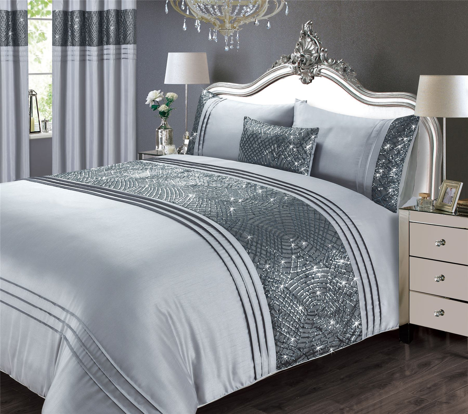 Great for sparkle lovers, these curtains feature a glittering border of sequins on a smooth matte satin. Eyelet header for easy hanging. Matching duvet set and boudoir cushion also available.