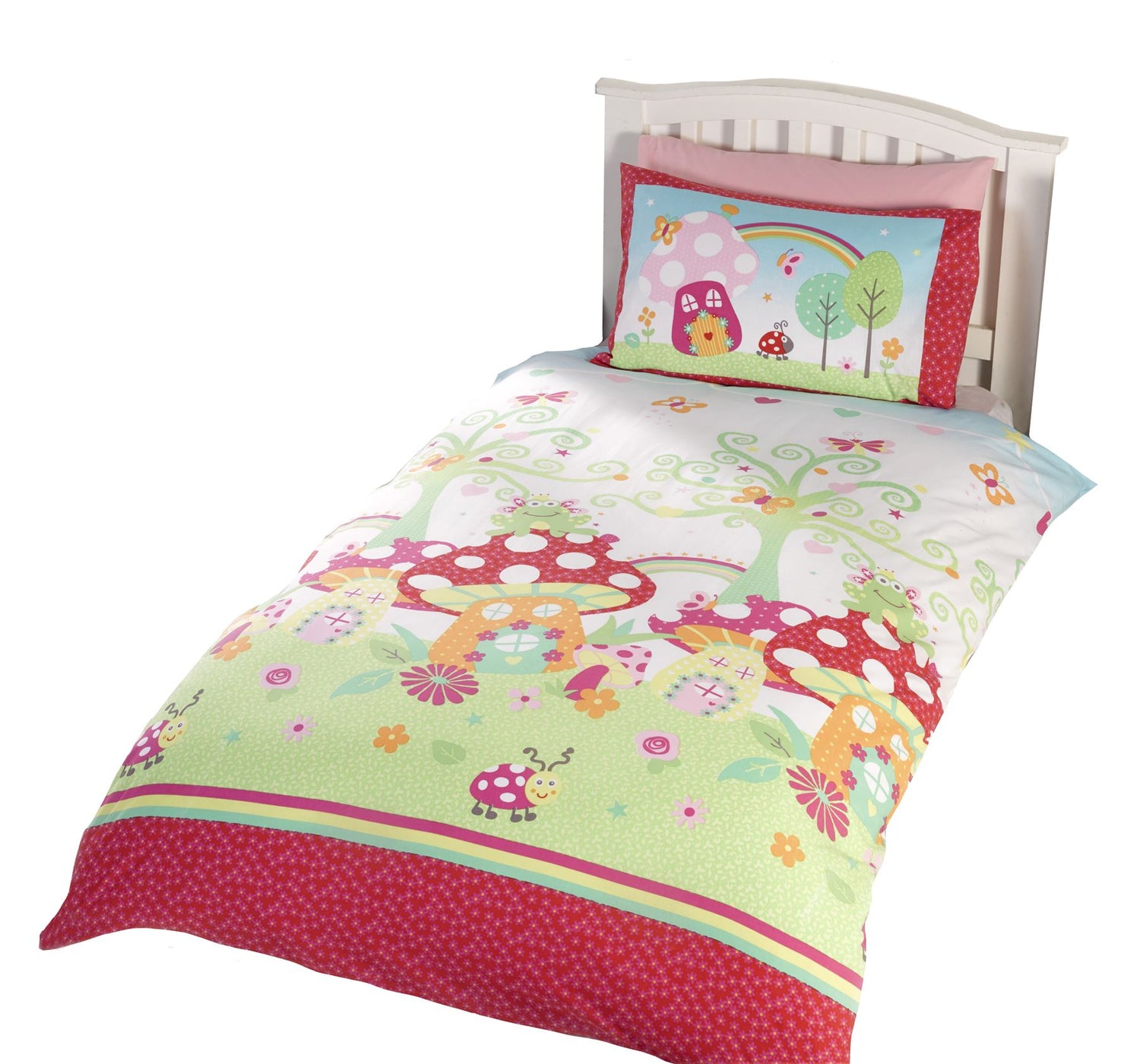 Pretty kids duvet set featuring giant toadstool house and cute little ladybird and frog characters. Cheerful, bright design printed on soft easy care fabric.