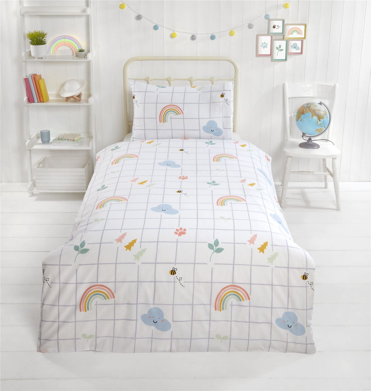 Our Little Happy Home range is made using sustainably sourced BCI cotton & recycled polyester. Designed by British designers, this duvet set shows the world with the slogan: there is no Planet B I can change the world. The reverse shows delicate bees and rainbows.