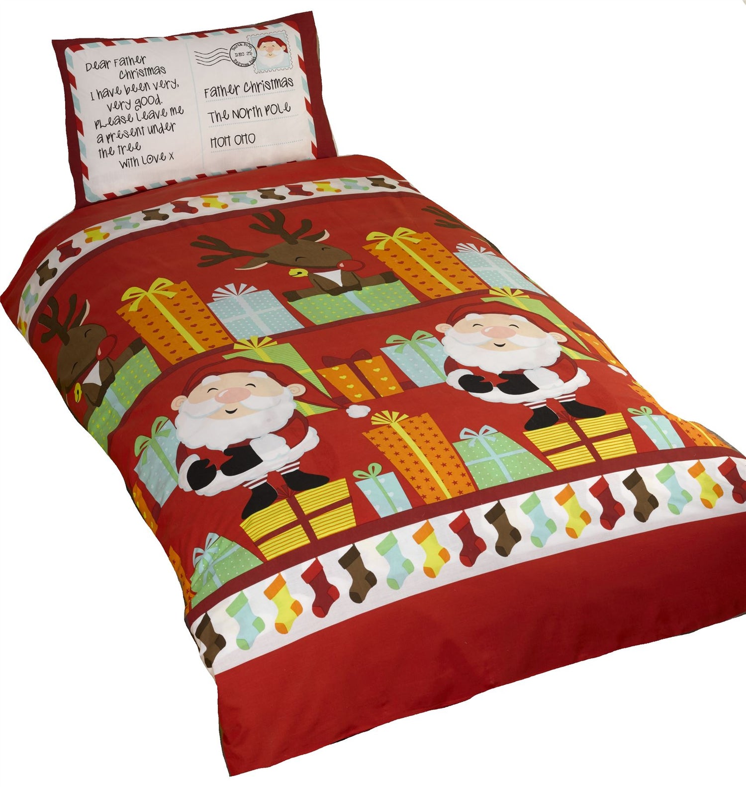 Santa's list christmas duvet cover design features all of your favourite festive motifs including stockings, reindeer and santa himself. Printed on a rich red background, this design will bring christmas to any childs bedroom.