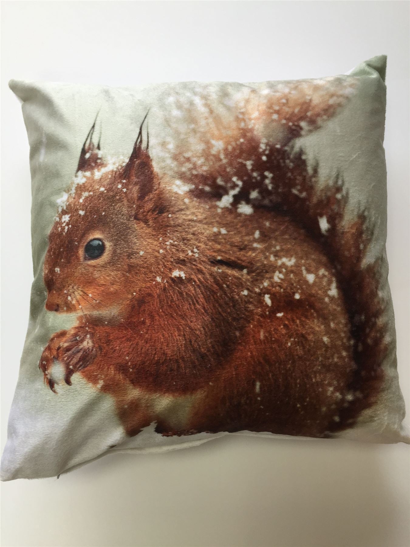 A cosy 43x43cm multi-coloured cushion featuring a friendly woodland squirrel printed on luxuriously soft velvet fabric