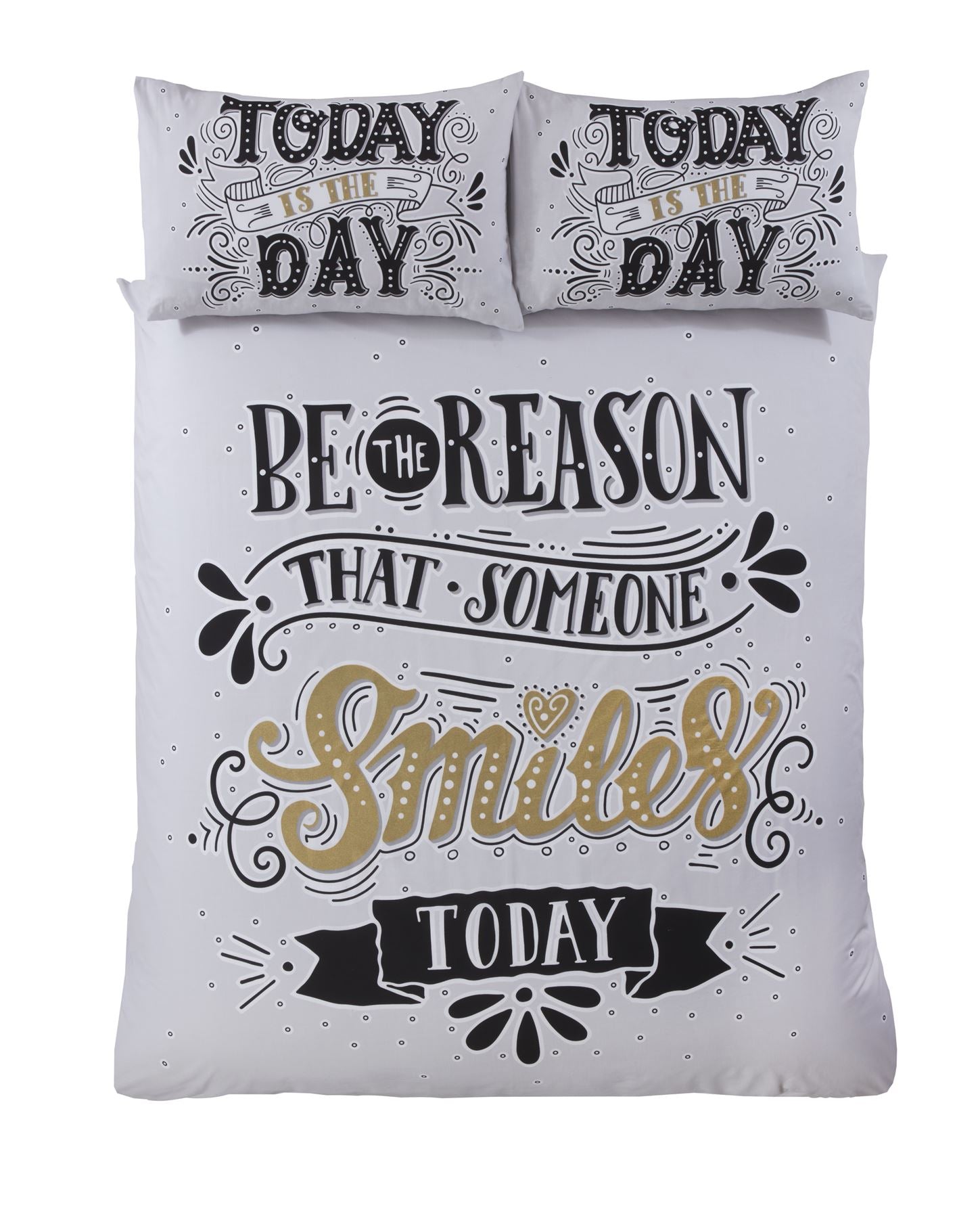 This design features the words "Today is the day" on the pillowcase/s and "Be the reason that someone smiles today" on the main body of the duvet cover beautifully printed this range is simply a lovely addition to any bedroom.