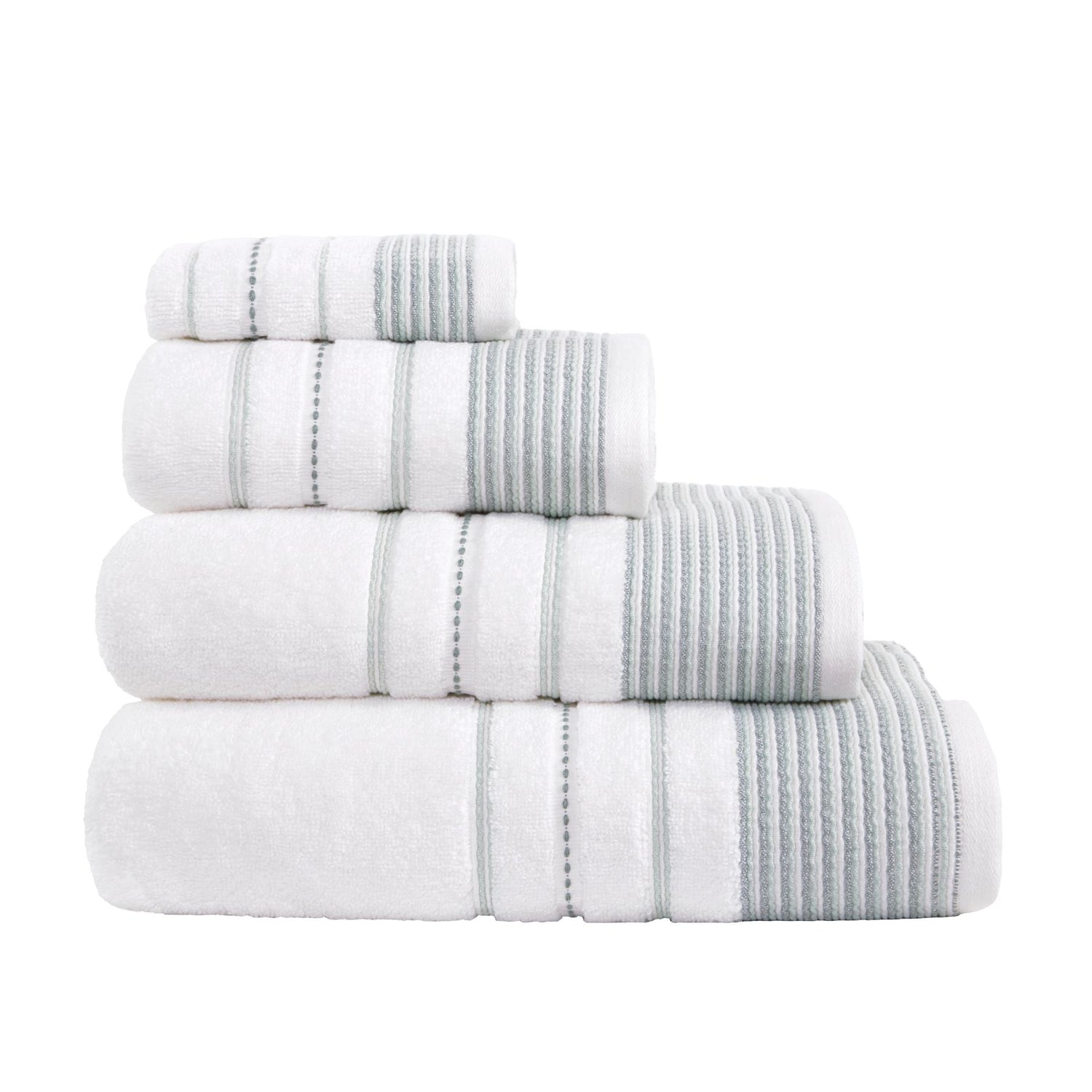 Presenting the Dakota Stripe Towel Collection. This crisp, striped design offers a striking and modern contrast to the solid white textured body, creating a refined and balanced aesthetic. Perfect for creating a spa-like atmosphere in your home, this set offers a perfect blend of high-quality comfort and contemporary design, ensuring a luxurious experience every time you step out of the shower. Available in Blue, Green and Natural colourways to suit every taste.