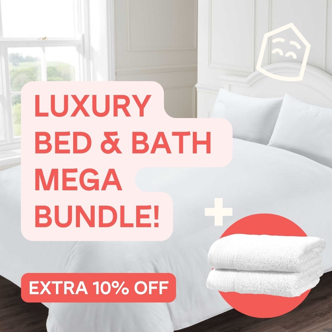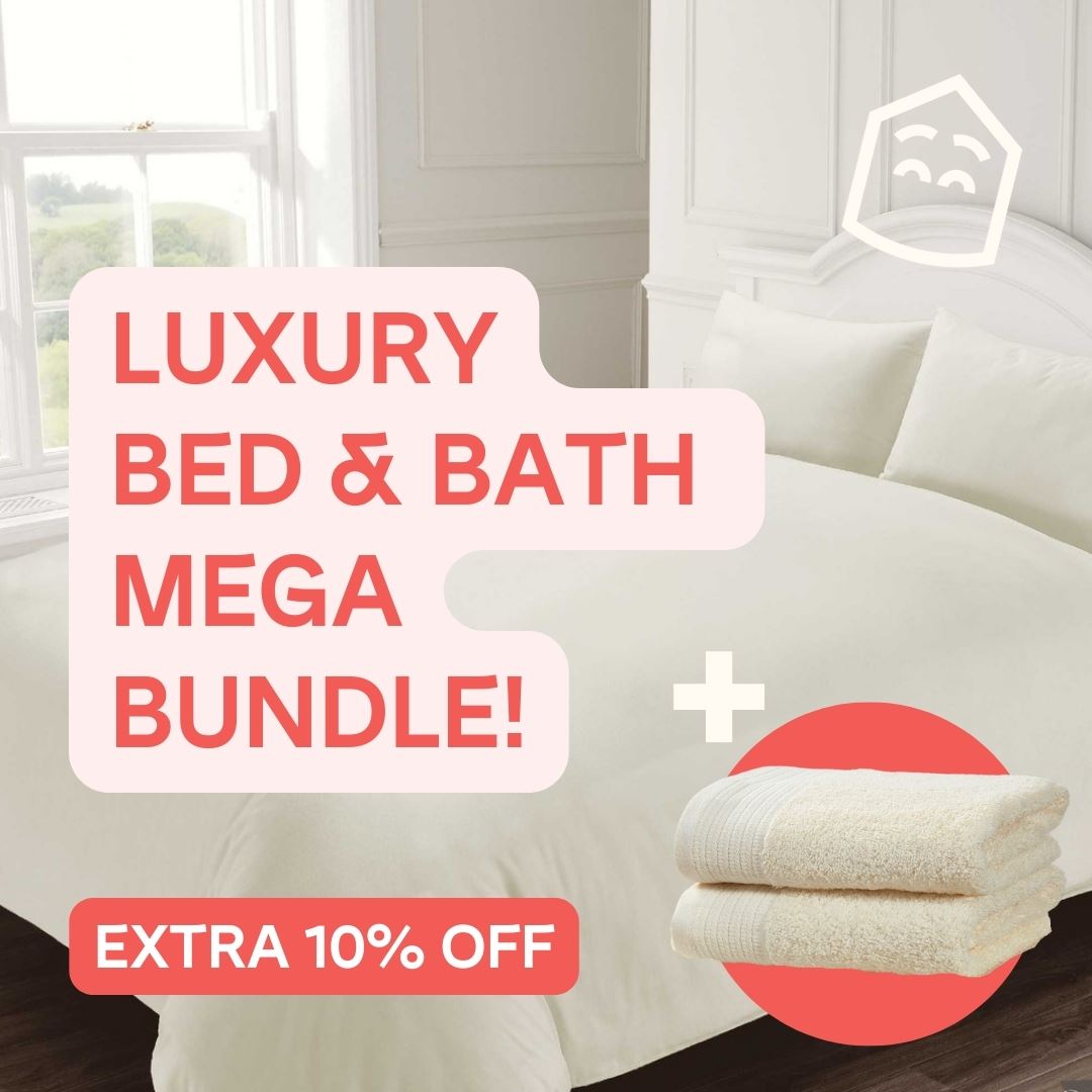 This Luxury 400 Threadcount Bed & Bath Mega Bundle comprises of: 1x 400 Threadcount 100% cotton quilt cover, 1x matching pillowcase pair, 2x 600GSM Happy Home 100% cotton matching bath towels. Buy it today and save an additional 10% over compared to buying each individual item.