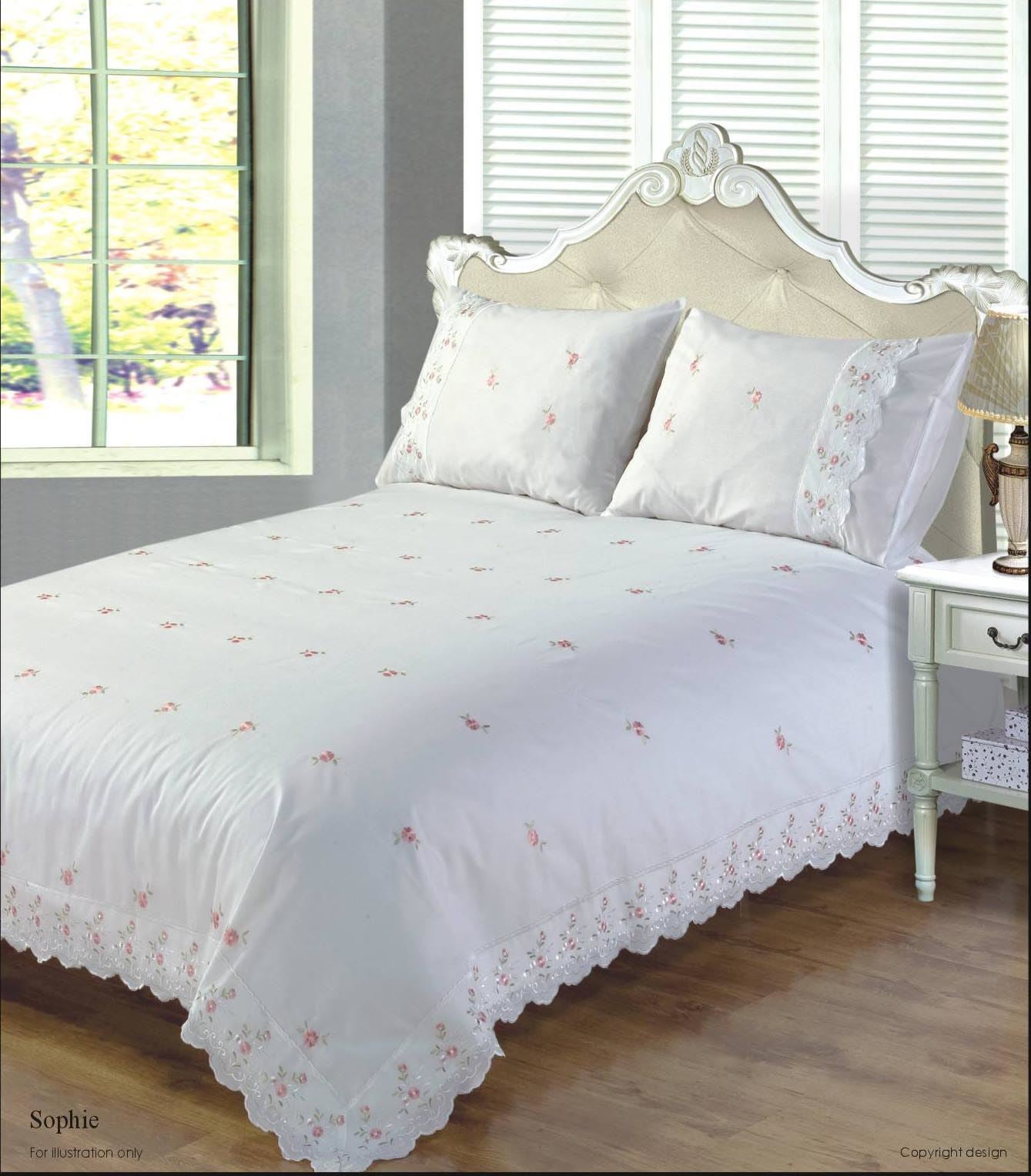 Our delicate sophie design features embroidered roses throughout on a cream or white base with broiderie anglaise lace trim to the duvet cover.