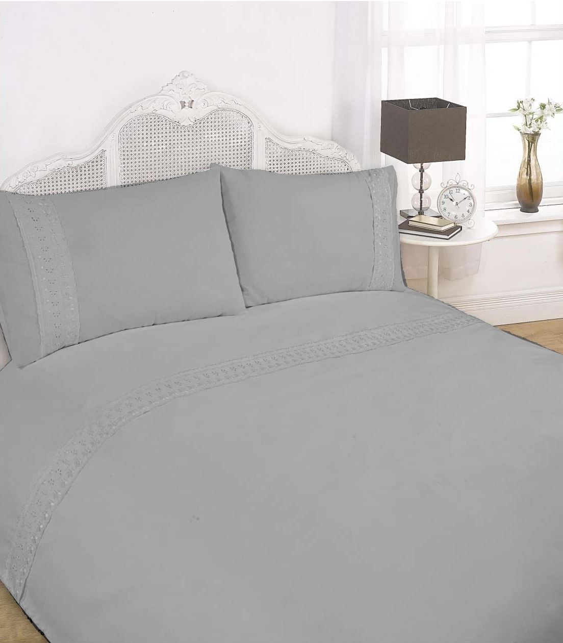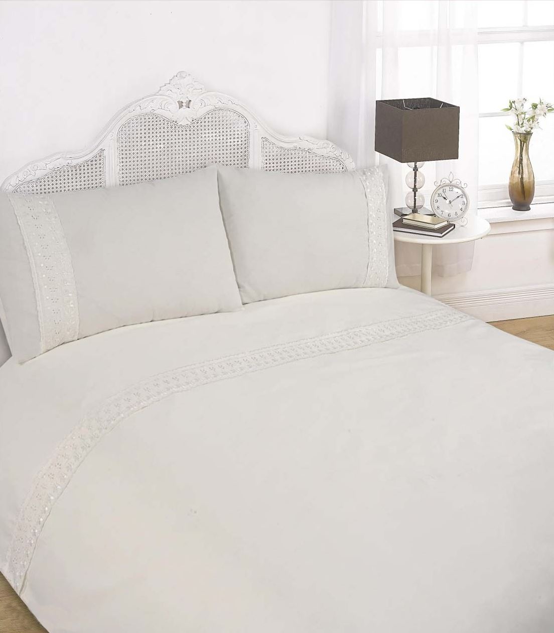 This simplistic but beautiful bedding set features an exquisite lace trim detail across the header of the duvet cover, with the lace trim detail carried through to the pillowcase/s.