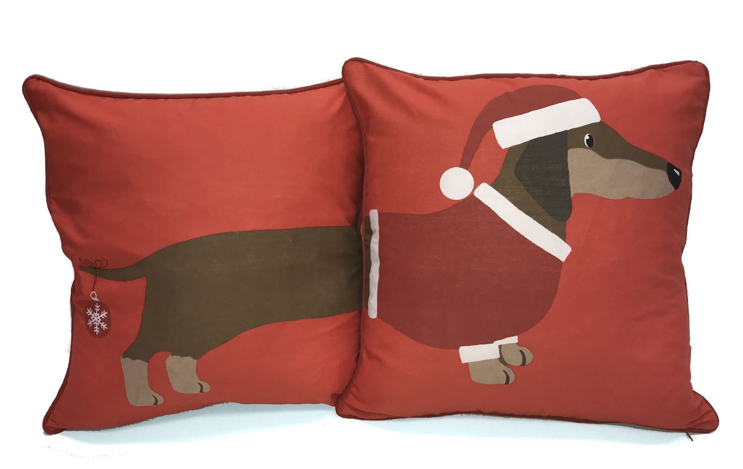 A colourful reversible cushion featuring a cute long Xmas sausage dog design with piped edging, measuring 43x43cm