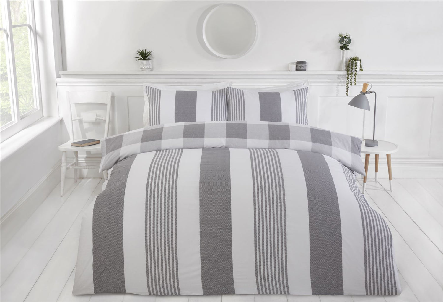 Our chambray range is made using sustainably sourced BCI cotton & recycled polyester. Designed by British designers, this design is fresh, clean and simple, with a stripe front and check reverse, it will bring a touch of class to any bedroom.
