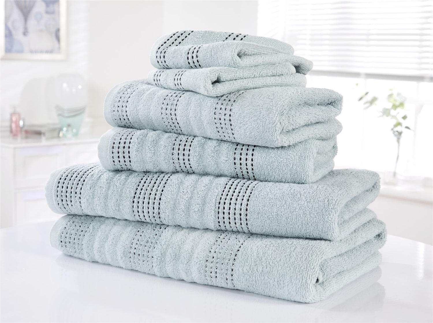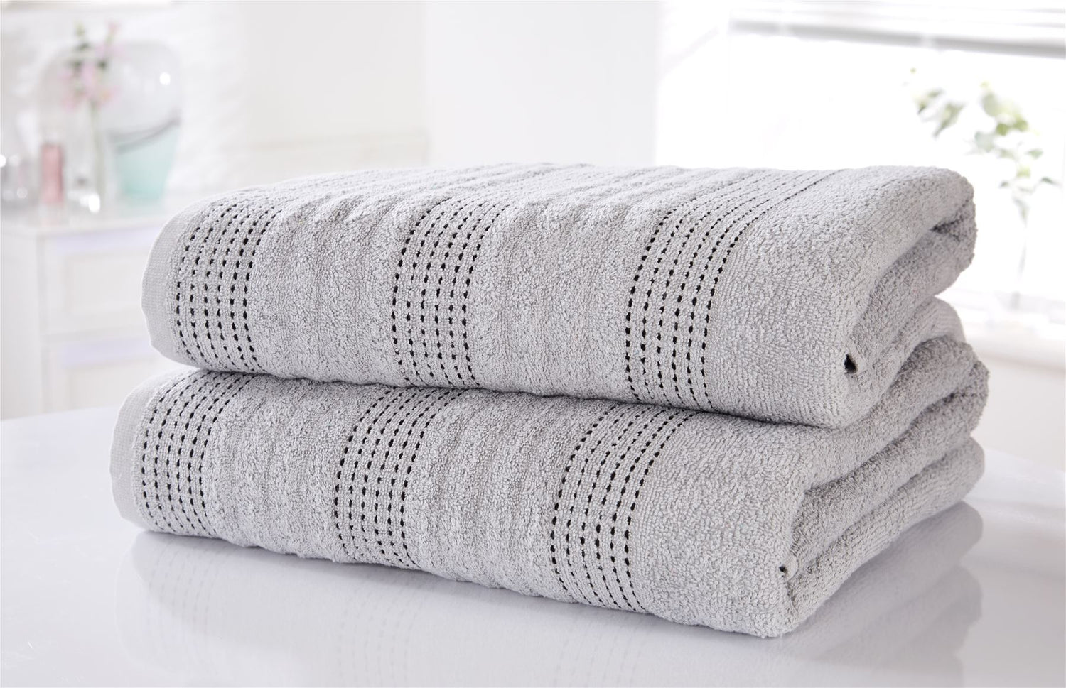 Our luxury 100% combed cotton spa bathroom towels feature an alternating stab stitch border. Super soft, highly absorbent and stylish bathroom towels.