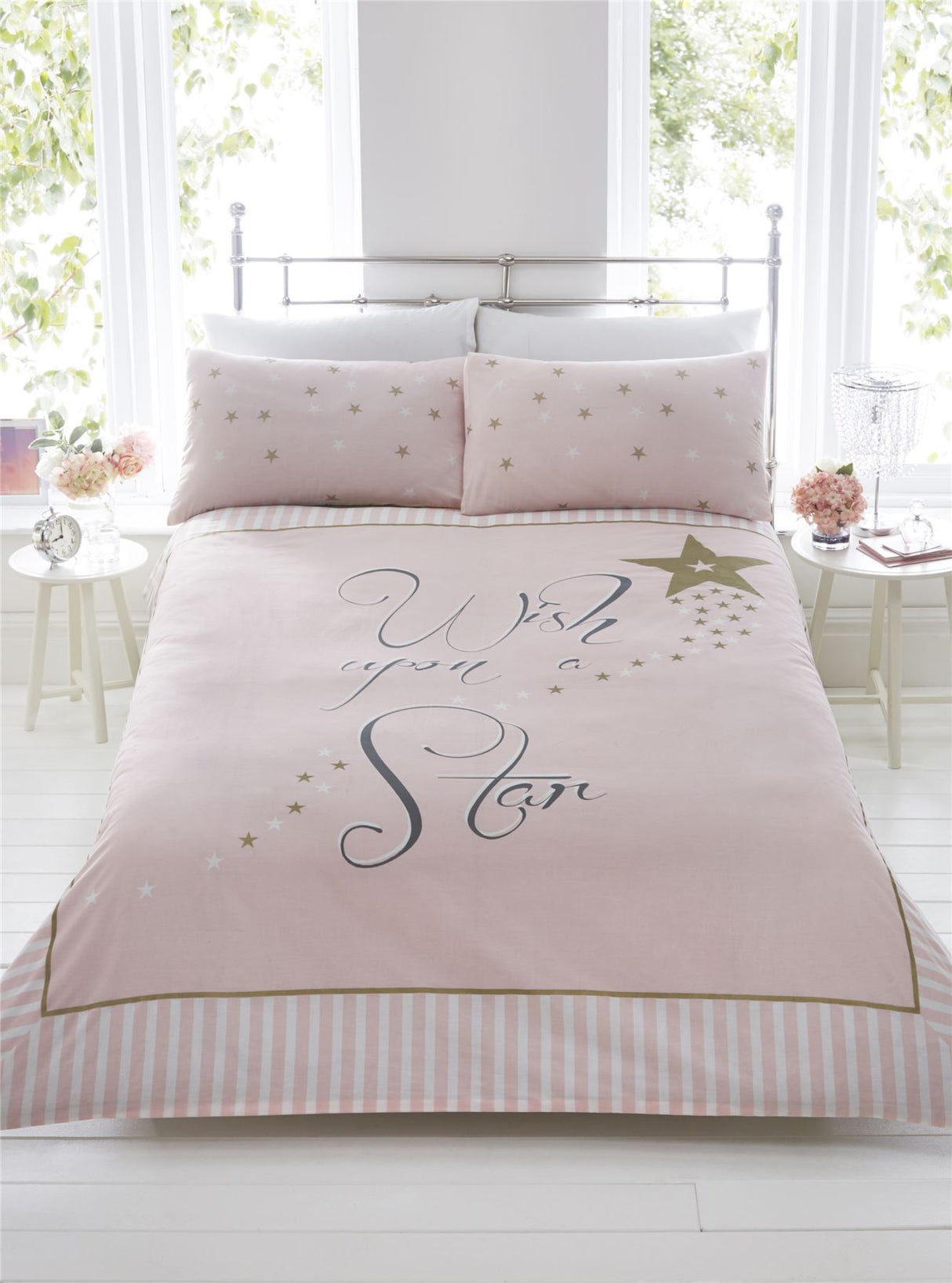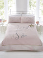 Modern and stylish blush pink duvet set featuring scrolly writing and gold stars with a stripe print border and star speckled pillowcase, perfect for adding a touch of sparkle to your bedroom.
